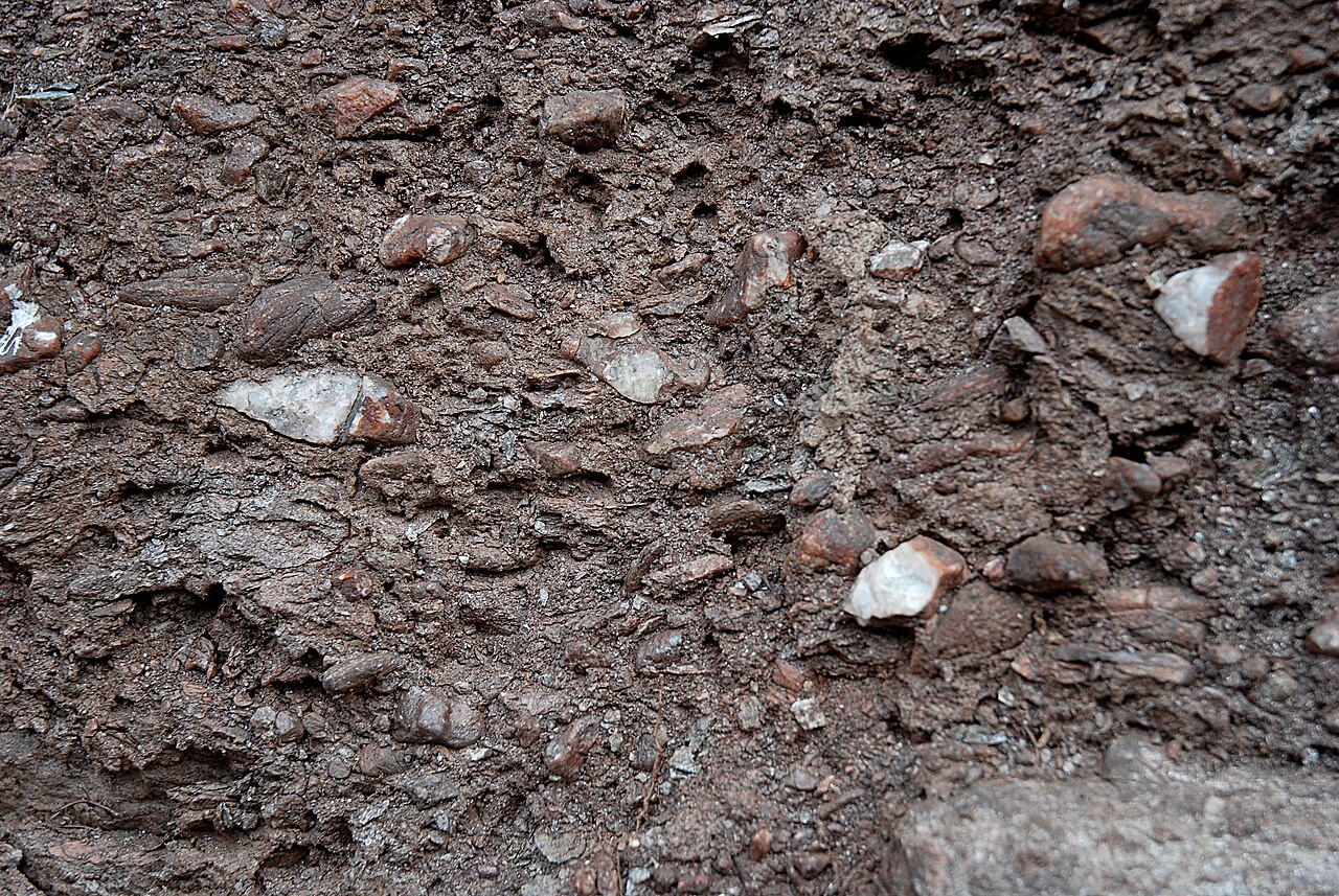 Il Conglomerato di Ponte Gardena costituito da frammenti di quarzo e clasti dei litotipi precedenti (Haneburger, Public domain, via Wikimedia Commons).