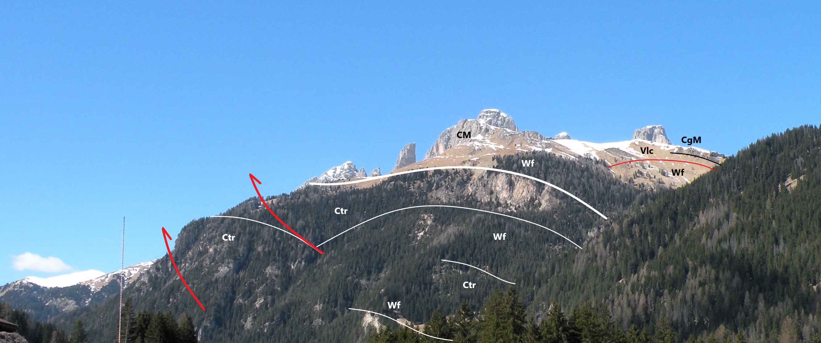 Il thrust del Col Rodella, reso evidente dalla posizione anomala della Formazione di Werfen che ricopre quella di Contrin, prosegue declinando verso nordest fino al Rio Antermont, dove scompare per immergersi sotto le Vulcaniti triassiche (Formazione del Fernazza) e il Conglomerato della Marmolada che le ricopre e che giace fortemente inclinato verso NE. Tra queste unità e le siltiti rosse del membro di Campill manca quasi completamente la serie intermedia che comprende Il Conglomerato di Richthofen, il Calcare di Morbiac, la Formazione di Contrin e quella di Buchenstein/Livinallongo. Sulla cesta che va dal Col de Salei al Col Rodella vi sono invece pochi metri di Buchenstein in facies di calcari nodulari con croste silicee su cui poggiano alcuni frammenti di scarpata (slope) di una piattaforma carbonatica in facies calcarea, il maggiore di questi è la parte sommitale della montagna dalla caratteristica forma semicircolare. Più che di una lacuna stratigrafica è più probabile che si tratti di un contatto tettonico, collegato allo scivolamento gravitativo verso nord alla base del gruppo del Sassolungo.