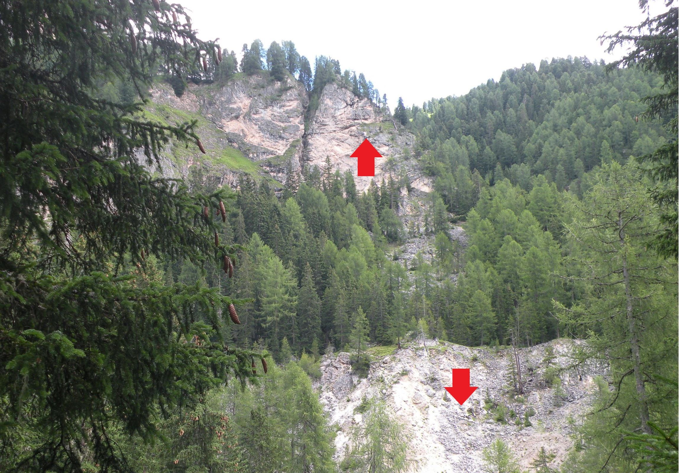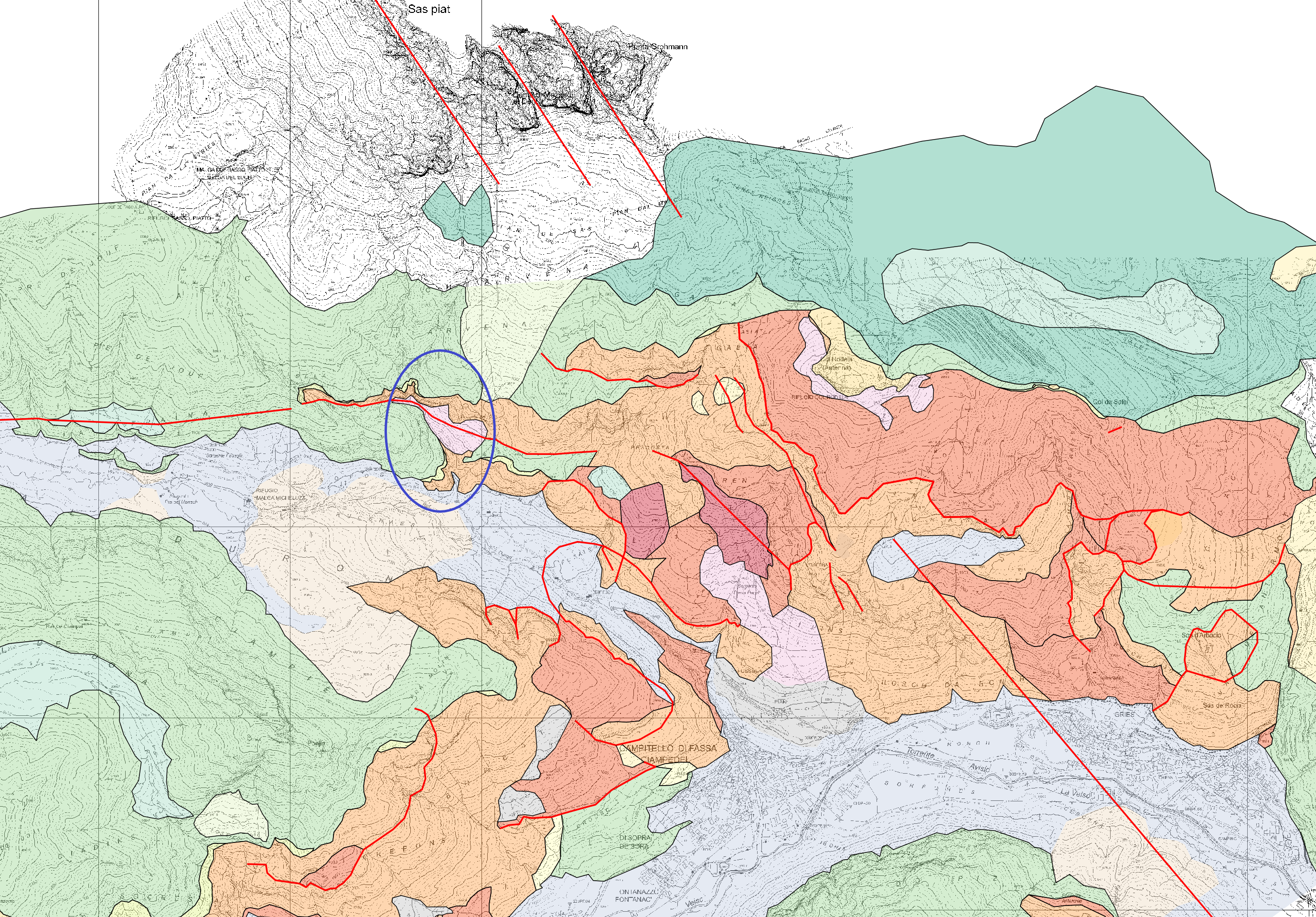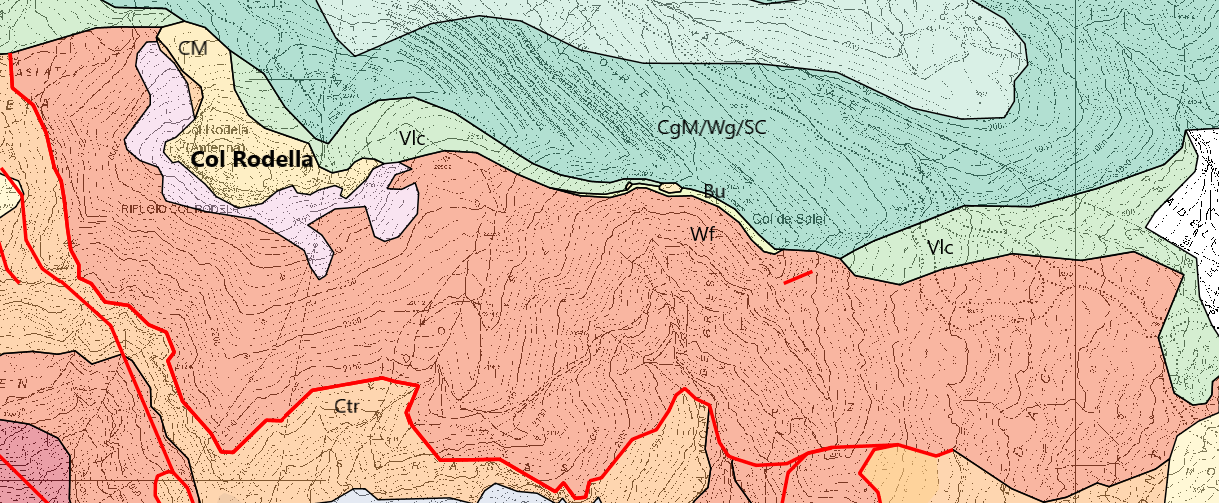Indicata dall'ellisse la faglia nell'immagine qui sopra. La dislocazione prosegue a sinistra lungo la Val Duron, mentre a destra incontra i cosiddetti 'sovrascorrimenti del Col Rodella'.
