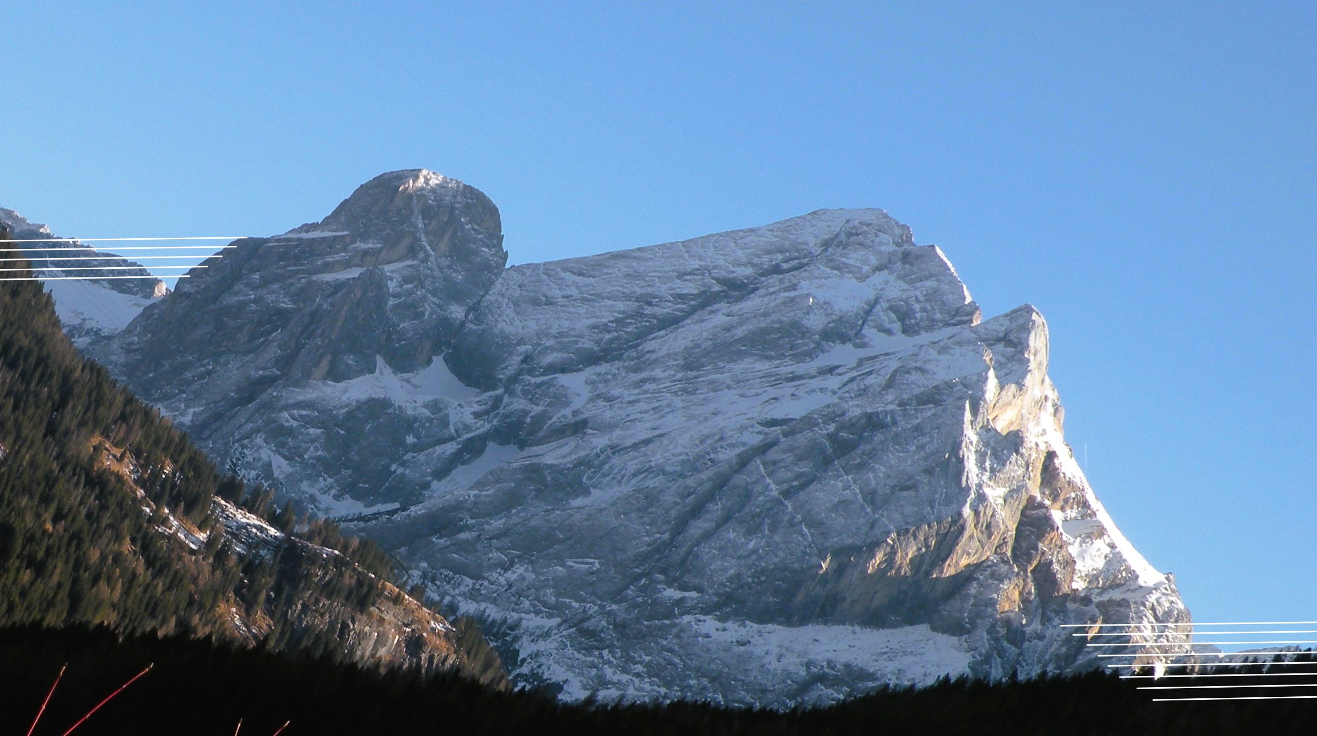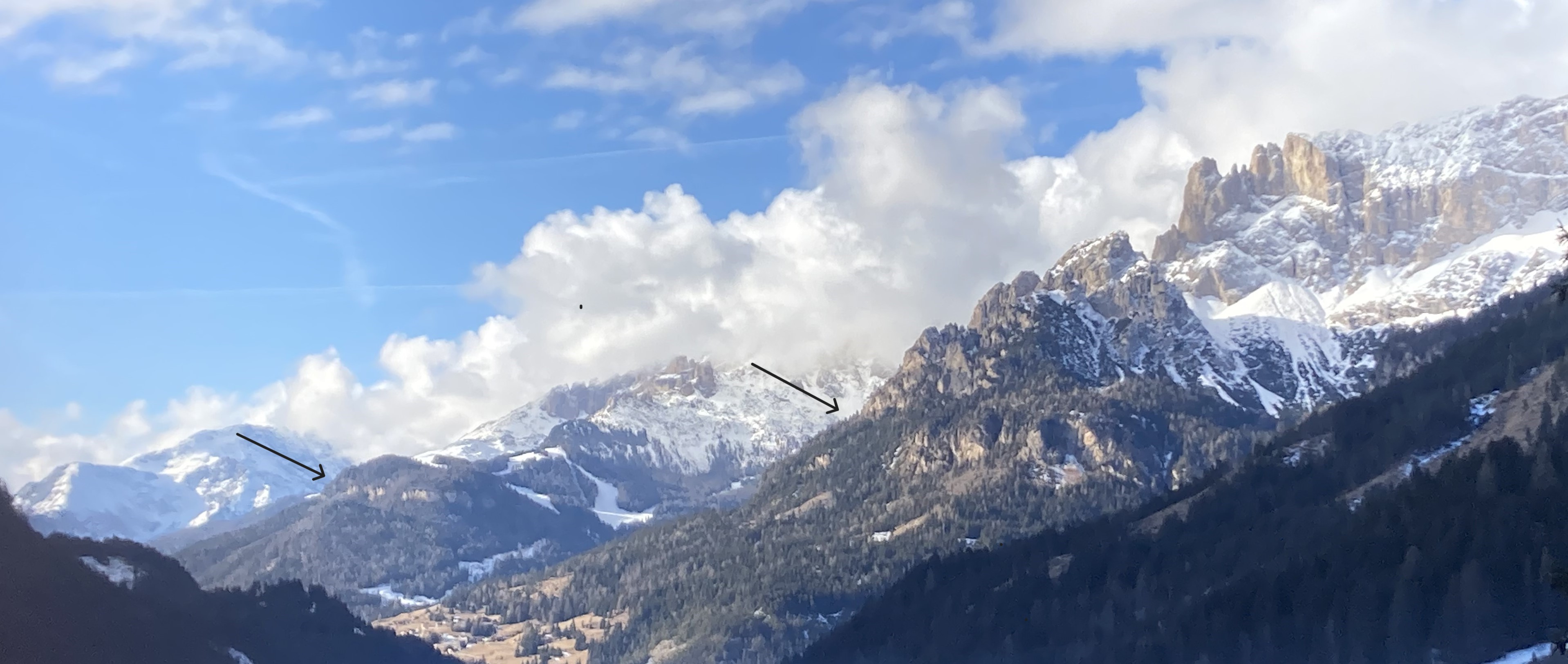 La piattaforma del Catinaccio/Rosengarten progradante (in espansione laterale) verso destra sulla Formazione di Buchenstein/Livinallongo (la cengia innevata sopra il bancone regolare del Contrin). Si può notare come lo spessore della formazione ricoperta aumenti con l'avanzare della piattaforma. Al centro dell'immagine sono ben visibili le clinostratificazioni con un angolo di circa 30° rispetto al piano orizzontale;