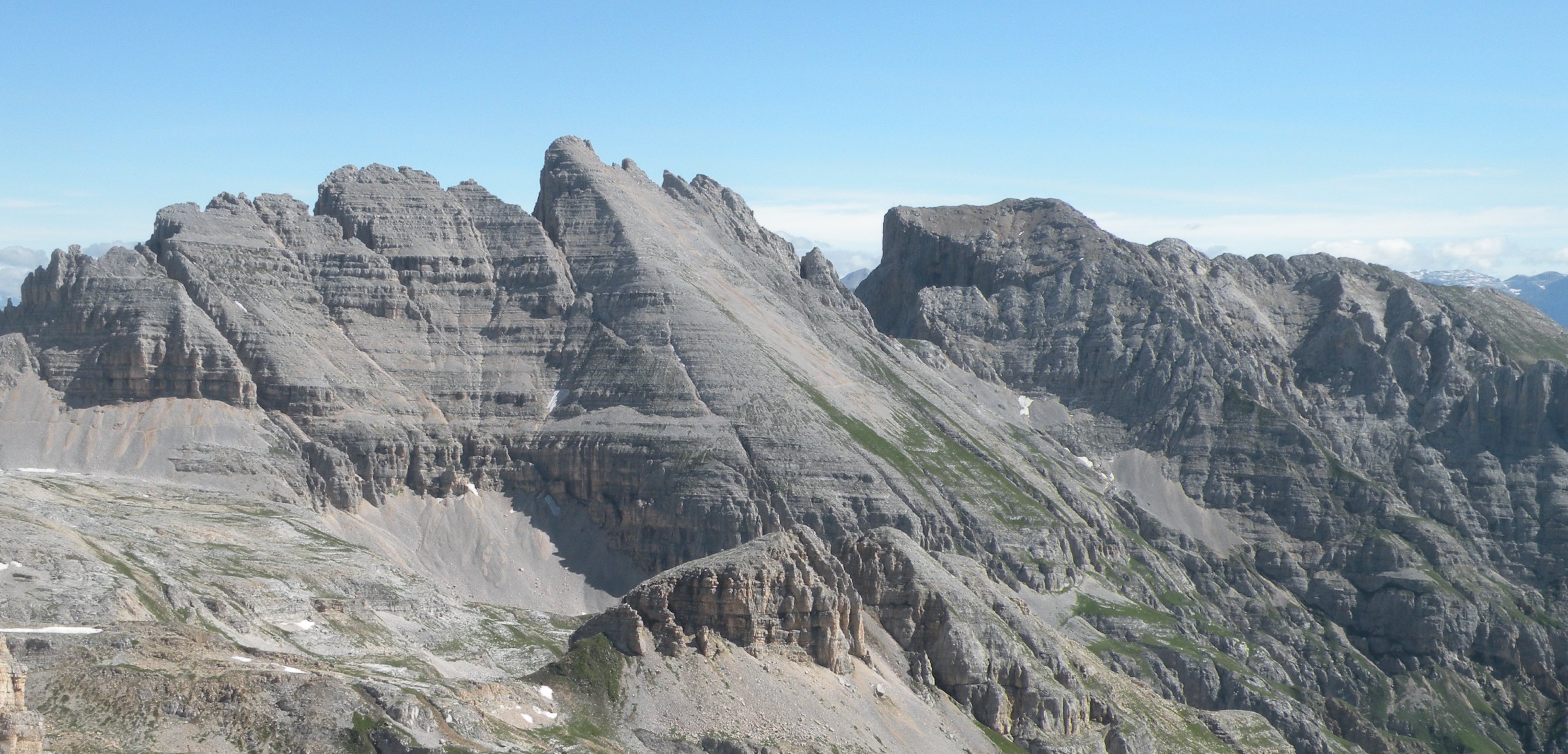 Panorama dell'arcipelago ladinico: le piattaforme sorgono ai lati del bacino anisico che si trovava al centro della foto. Sullo sfondo la catena porfirica dei Lagorai, che corrisponde al fianco meridionale del sinclinorio dolomitico.