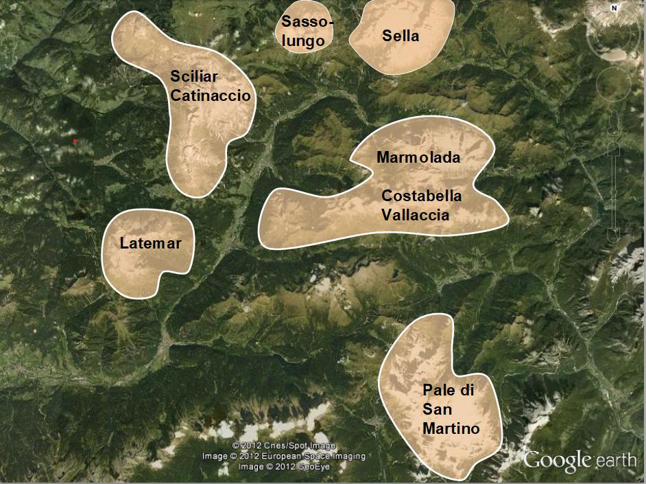 L'immagine satellitare mostra ciò che rimane delle piattaforme carbonatiche ladiniche.